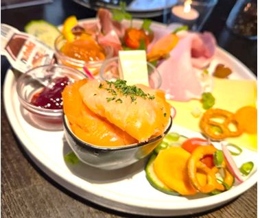 Dort erwartet uns eine gemütliche Atmosphäre, und wir können entweder das reichhaltige Buffet genießen oder individuell ausgewählte Leckereien wie Brötchen, Croissants, Obstsalat, Eier und mehr bestellen.