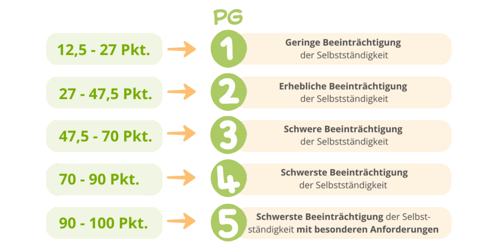 Für den Pflegegrad 1 sind 12,5 bis unter 27 Punkte erforderlich. Das bedeutet: Es bestehen leichte, aber erkennbare Einschränkungen im Alltag.